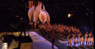 Behind a series of feathers Madonna emerged and appeared to be invoking her inner Cleopatra-cum-Roman solider.