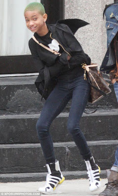 Aware of the effect of her head-turning footwear and colourful buzz-cut, Willow kept the rest of her outfit simple and with the black jacket and an expensive Louis Vuitton bag.
